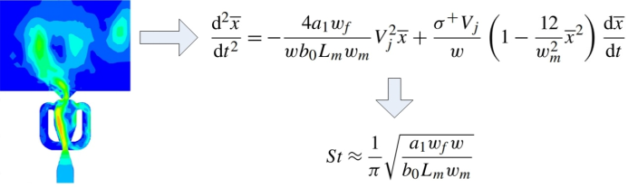 本研究基于第一性原理的物理推导,提出了一种基于物理机制的非线性降阶动力学模型。针对带有混合室和双反馈通道的典型流体振荡器,通过解析主射流中流体微团的水平方向动量,分别对混合室内的射流附壁效应和双通道反馈机制进行建模,最终推导得到形式类似于范德波尔方程的降阶常微分方程。基于此模型,本研究进一步推导了斯特劳哈尔数(St)的理论预测公式。对于典型的流体振荡器,该公式给出的St数预测值与实验测量值高度吻合。