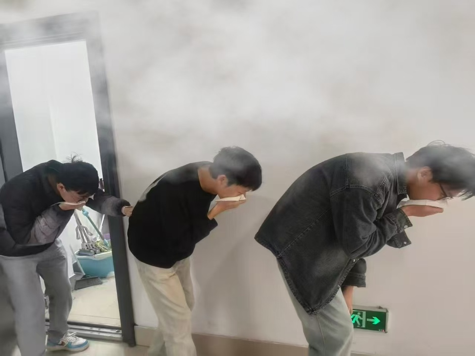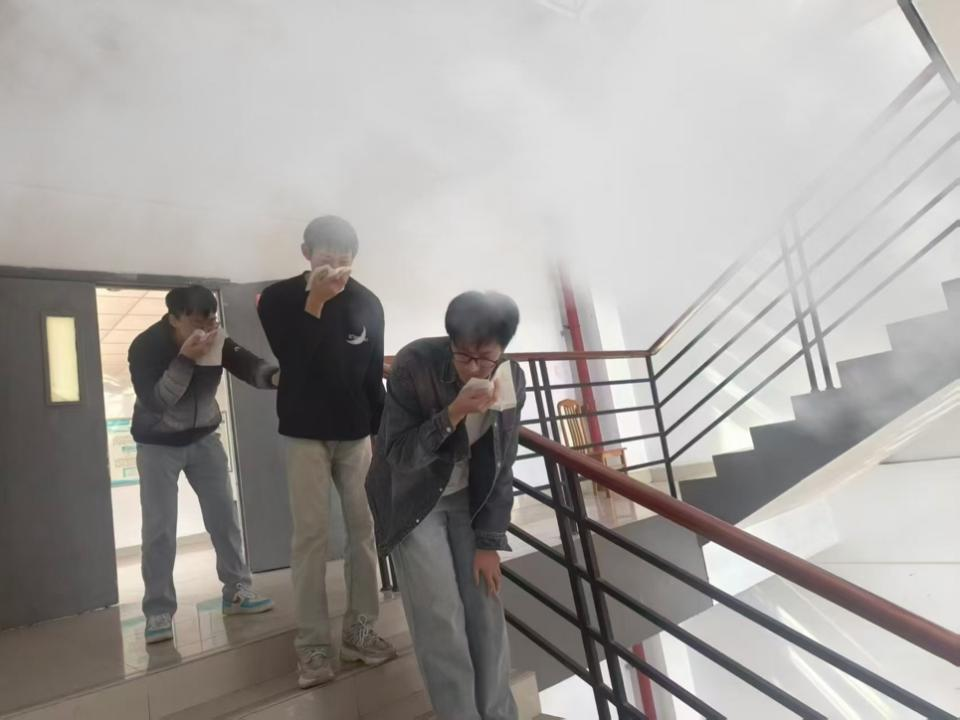 演练开始前,学办江昕玥老师向同学们进行细致的消防知识讲解,包括消防安全基本注意事项、火灾发生时的楼层位置判断、灭火器的正确操作方法及标准逃生流程,确保每位同学在紧急情况下能做出迅速、正确的反应。在演练过程中,同学们严格遵循逃生要领,用湿毛巾捂住口鼻,低姿弯腰,沿着预定疏散路线,快速、有序地撤离至指定安全区域。现场气氛紧张而有序,同学们沉着冷静,动作规范,展现出了良好的心理素质和应急反应能力。