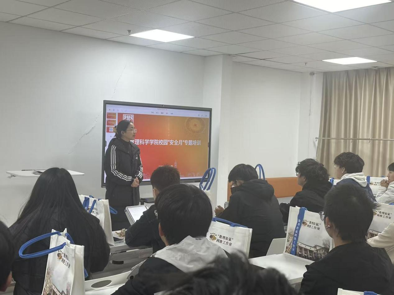 阅读次数: 发布时间:2025-11-20 更新时间:2025-11-20为持续夯实校园安全基础,进一步提升学生安全工作的针对性和实效性,数理科学学院于11月19日下午在南苑“一站式”社区面向本研所有班级安全委员举办校园“安全月”专题培训,学办主任张文闻老师、辅导员杨德旭老师、江昕玥老师参加,培训会由江昕玥老师主持。