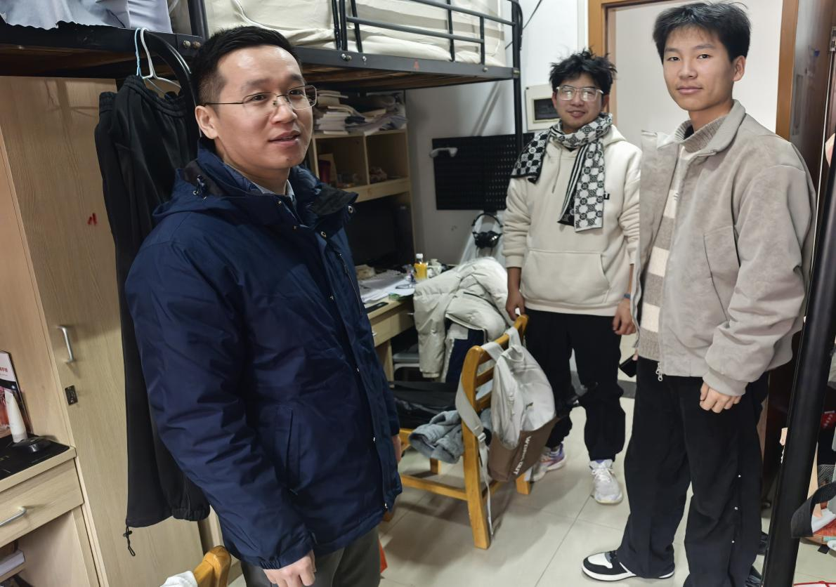 检查过程中,蔡亚峰副书记与辅导员们重点查看用电安全、消防隐患及环境卫生情况,仔细排查违规用电、杂物堆积等问题。遇到需要整改的地方,老师们当场提醒同学们,耐心告知注意事项,督促大家及时处理,确保隐患彻底清零。同时,老师们还与同学们亲切交流,详细了解大家的课程学习、科研进展和假期安排,认真倾听大家的想法和需求。并反复叮嘱同学们,要时刻绷紧安全弦,增强安全意识,养成规范用电、保持环境整洁的好习惯,做好节日期间宿舍和工作室的安全管理。